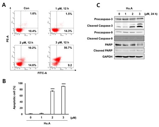 Levels of mitochondrial ROS were measured by MitoSOX assay in Hu.A-treated DLD-1 cells. Mitochondrial ROS was markedly increased by Hu.A treatment at concentrations of 2 and 3 μM (Figure 4A,B). The mitochondrial depolarization was examined by tetramethylrhodamine methyl ester (TMRM) staining and the results showed that the mitochondrial membrane of the cells was significantly depolarized upon Hu.A treatment (Figure 4C,D). To confirm whether the cytotoxicity of Hu.A was related to the mitochondrial ROS, the viability of DLD-1 cells was examined by MTT assay upon treatment with MitoTEMPO, which is a specific scavenger of mitochondrial superoxide. In DLD-1 cells pre-treated with MitoTEMPO, the cytotoxic effect of Hu.A was significantly reduced (Figure 4E). In addition, results of the Annexin V and PI staining and the western blotting assay showed that Hu.A treatment significantly induces apoptosis in DLD-1 cells (Figure 5).
