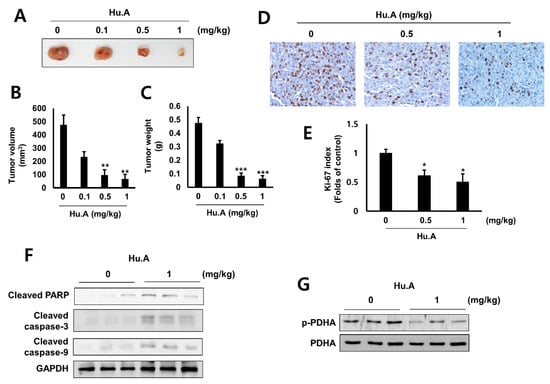Hu.A reduced the tumor growth in vivo in LLC cell allograft mice model. The LLC cells were injected into the dorsal subcutaneous skin of C57BL/6 mice. On the 14th day, Hu.A at concentrations of 0.1, 0.5 and 1 mg/kg/day were intraperitoneally injected into the mice. (A) The representative picture of the tumors is shown. The tumor volume (B) and weight (C) were measured. Tumor volume and weight are indicated as mean ± SD. **, p < 0.01 and ***, p < 0.001 compared with the control group. (D) The tumor tissues were stained with the Ki-67 antibody and examined at ×200 magnification. (E) Ki-67 expression index was determined with Aperio Image scope software for three separate tumors. The data are shown as mean ± SD, respectively. *, p < 0.05 compared with control. (F) The expression of cleaved-caspase-3, caspase-9, and PARP in the tumor tissues were analyzed by western blot assay. GAPDH was used as a loading control. (G) The levels of phosphor-PDHA and total PDHA in the representative tumors were analyzed by western blot assay.