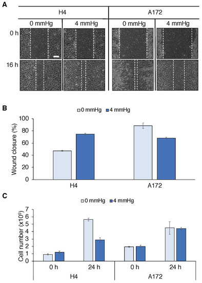 A wound healing assay was performed on cancer cells as previously described [70]. In brief, cancer cells were seeded in the inner chamber of a transwell insert ( cells/insert) and allowed to form a monolayer. A scratch wound was then introduced on the cell monolayer, cells were washed twice with PBS and then were stimulated with 4 mmHg stress for 16 h. Control cells were covered with an agarose gel (i.e., 0 mmHg). Images from at least three different fields from each condition were taken at 0 h and 16 h. The cell-free area was quantified using the ImageJ software [71]. Quantification was performed for each condition using the following formula: (Area of the wound at 0 h − Area of the wound at 16 h)/(Area of the wound at 0 h).