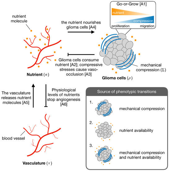 In the last few years, it has become increasingly clear that tumor microenvironment plays a critical role in tumor progression and resistance to therapies [6,7,8,9,10]. Two important components characterize the tumor microenvironment, namely chemical and mechanical factors. A major role amongst the first is played by oxygen, and particularly by its deficiency (hypoxia), which correlates with tumor invasiveness and malignancy [11]. Regarding the physical environment, the growth of a tumor in the confined space of a tissue is known to generate mechanical forces [12,13]. These forces may hinder cell proliferation, induce apoptosis, enhance cellular invasive potential and lead to blood vessel occlusion [12,14,15,16]. In response to chemical and physical stimuli, tumor cells exhibit phenotypic changes. A prominent phenotypic plasticity mechanism is related to the mutually exclusive switching between the proliferating and migratory phenotypes. This phenomenon, also known as the Go-or-Grow (GoG) mechanism, has been suggested to impact the invasive potential of gliomas [17,18,19,20,21,22]. The interplay between tumor behavior and microenvironmental stimuli is being actively investigated, and it is becoming the target of novel therapeutic strategies [23]. For instance, vascular normalization and stress-alleviation approaches have been investigated to treat solid tumors [24]. Stress-alleviation therapies propose to reduce mechanical stresses within the tumor to decompress tumor blood vessels and thus, improve tissue perfusion and the delivery of chemotherapeutic agents. This is achieved by targeting specific components of the tumor microenvironment, such as collagen and hyaluronan [12]. Depletion of these constituents by repurposing of approved drugs with anti-fibrotic properties has indeed showed to reduce tumor stiffness and mechanical stresses, increase tissue hydraulic conductivity and decompress tumor blood and lymphatic vessels [25,26,27]. However, due to the complexity of the tumor–microenvironment interplay, success rates of those normalization therapies are largely variable and still under intense investigation.