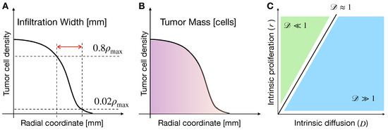 Graphical representation of model observables and glioma characteristics. Schemes representing tumor infiltration width (IW) (A) and tumor mass (TM) (B), describing tumor invasiveness and burden in the surrounding tissue, respectively. (C) Characteristics of gliomas across the cellular intrinsic diffusion and proliferation space. The relative importance of cell migration to proliferation is described by the non-dimensional number , which splits the plane in regions where proliferation (green) or migration (blue) dominate [38].
