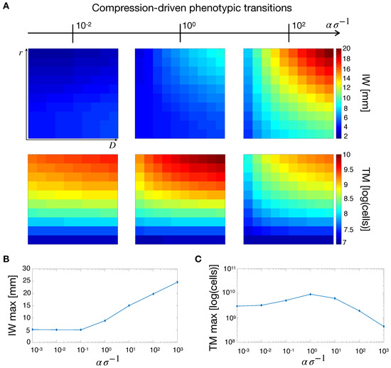 Tumor observables for mechanical-induced phenotypic switching. (A) Simulation maps of tumor IW and TM with respect to different values of effective stiffness . From left to right with . IW increases for increasing values of the ratio, whereas TM shows a maximum for intermediate values of effective stiffness. The maximum IW (B) and TM (C) are obtained for different values of effective stiffness, with , and varied. While IW shows an increasing trend with effective stiffness, TM displays an optimum for intermediate values.