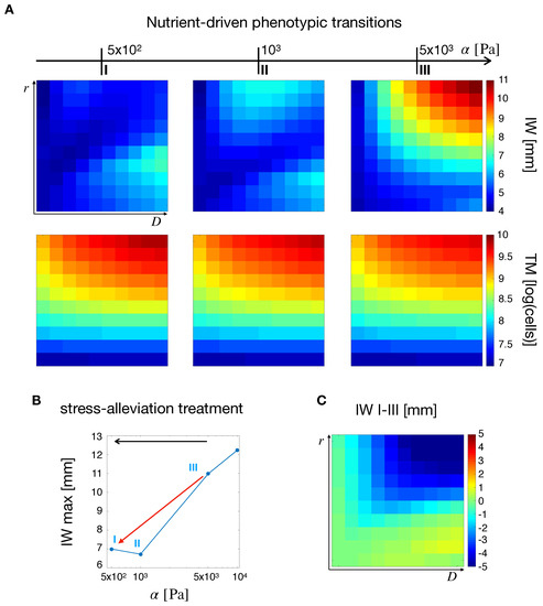 Tumor observables and the effects of a stress-alleviation therapeutic strategy in the case of nutrient-induced phenotypic switching. (A) From left to right, simulation maps of tumor IW and TM for varying tissue stiffness from to . A non-trivial effect of stiffness on IW and a monotonic decrease in TM for increasing values of is observed. (B) Maximum value of IW for different tumor stiffness values. The red arrow points in the direction of a stress-alleviation treatment, where shorter IWs are obtained for decreasing values of . (C) Simulation map for the difference in IW between the points I and III in B. Gliomas with the highest values of D and r display the highest reductions.