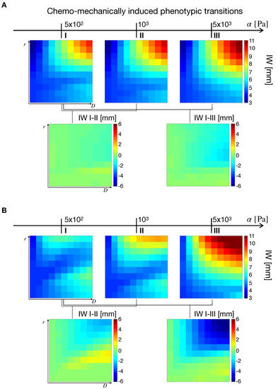 Simulation maps for the effects of chemo-mechanically induced transitions on tumor IW. In both cases (A,B), the top row shows three IW maps for different values of , whereas the bottom row the IW variation occurring at different stiffness values. Simulations were obtained for with (A) and (B).