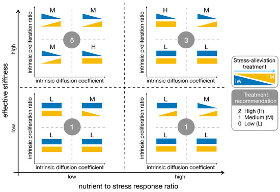 Model results for the influence of stress-alleviation strategies on chemo–mechanically induced phenotypic transitions are summarized in Figure 7. In several cases the treatment produced opposing results: the IW decreases, but an increase in TM was observed at the same time. Indeed, if cells reduced their migratory phenotype due to the treatment, they become more proliferative, increasing TM. This may lead to tumors with high cellular densities but decreased invasive behaviors, possibly resulting in better outcomes for surgery. Another interesting point was visible in the bottom–left quadrant of the scheme, where the results for low mechanosensitivity and low nutrient-to-mechanical response are summarized. In this case the stress-alleviation strategy had limited impact on the tumor, being poorly effective in reducing its infiltrative behavior. For tumors in this area, adjuvant treatments potentially increasing cell mechanosensitivity may be sought, restoring the efficacy of the stress-alleviation strategy. To conclude, we estimate the impact of stress-alleviation strategies on the different cases by introducing a scoring system. We assign 0 to the cases in which treatment recommendation is low (L), i.e., the treatment does not produce significant changes or worsens tumor behavior. We assign 1 to the cases in which treatment recommendation is medium (M), e.g., reduction of IW together with increase of TM; and 2 for the cases of potentially successful outcomes (the treatment is highly recommended—H), i.e., reduction of IW and no change or decrease in TM. We report the labels of the different cases in Figure 7, and compute the resulting score for the fitness of the stress-alleviation treatment. The best fit to the treatment is obtained in the top-left quadrant, i.e., for low nutrient to stress response and high effective stiffness. On the other hand, low mechanosensitivity led to poor scores, discouraging the use of this treatment for those situations.