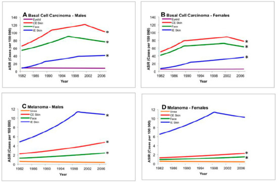 Prior research is consistent with the findings of this study, although there has been no previous study quantitatively comparing peri-ocular malignancies to other anatomical locations [44,45,46,47,48]. A large population-based study in the United States analyzed incidence rates for BCC and squamous cell carcinoma during the years 1972–1973 and 1977–1978 and found that the incidence of both tumors increased in nearly all sites, with the exception of the eyelid, which appeared to be decreasing [44]. A registry-based study in the Netherlands (1975–1988) reported a fluctuating pattern of BCC incidence in the eyelids of females, while increases were observed for the face, neck, and scalp [45]. A large population-based study in Finland (1953–1997) reported an average increase of eyelid BCC over its entire period; however, incidence rates stabilized and began to decrease after 1983 [46]. Similarly, a smaller registry study from Singapore (1968–1995) also reported an average increase in all eyelid tumors (84% basal cell carcinoma) over the entire study period, but rates stabilized for males after 1978 and for females after 1983 [47]. Although not specific to BCC, a long-term registry-study in Sweden (1960–2004) found evidence of another UVR-implicated tumor—squamous cell carcinoma—increasing in all skin sites except the eyelid [48].