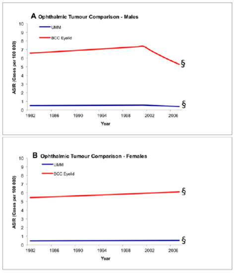 Test of parallelism comparing incidence trends between ocular tumors using registry data, 1982–2007. There is no statistically significant increase in the incidence of basal carcinoma of the eyelid and uveal melanoma. § Denotes parallel trend (p < 0.05). ASIR: age-standardized incidence rate; BCC: basal cell carcinoma; UMM: uveal malignant melanoma.
