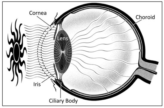 Sagittal schematic of the eye demonstrating ultraviolet exposure of iris and choroid, with sparing of the ciliary body due to protection by the iris.