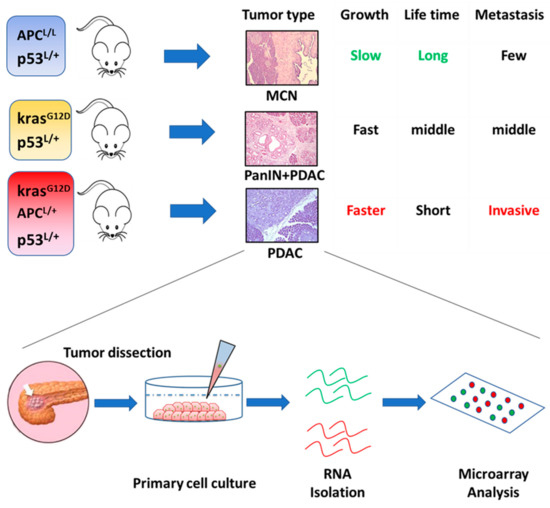 The three genetically engineered mouse models of pancreatic cancer established in our laboratory, and a flowchart for the study of gene expression profiles.