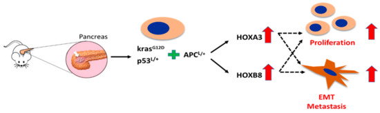 Recently, we created three GEM models of pancreatic cancer (Figure 1). The first model was of PA53 mice, which exhibited a heterozygous loss of the adenomatous polyposis coli gene coupled with p53 deficiency. These mice develop a mucinous cystic neoplasm at an early stage, which slowly progresses into carcinoma [51]. The second model was the classic KPC mice, which exhibit a Kras mutation and p53 inactivation. These mice develop PanIN around 8–10 weeks of age, and malignant tumors about 12 weeks after birth. The third model of KPA mice was the most aggressive. These mice contain all three genetic defects mentioned in the previous two GEM models [52]. We compared the gene expression profiles of pancreatic cancer cells isolated from PA53 and KPC mice by microarray analysis. Our results identified seven upregulated and three downregulated Hox genes in KPC relative to PA53 mice (Table 1).