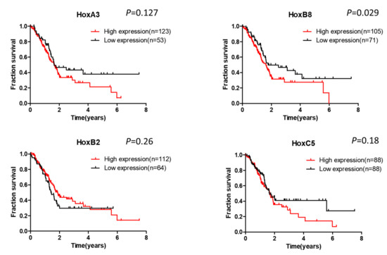 Until now, few studies reported the association of Hox expression with clinicopathological features in pancreatic cancer. We searched the information from a public database The Human Protein Atlas (https://www.proteinatlas.org). As shown in Figure 3, high expression of HoxA3, B8, and C5 is correlated with poor survival in pancreatic cancer, suggesting an oncogenic role of these members. On the contrary, HoxB2 expression is not linked with survival. The result shown in the database is the expression of mRNA. The protein level of Hox members in pancreatic cancer and their association with clinical outcome needs further characterization.