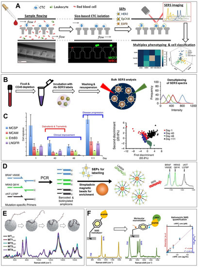 - Zhang, Y.; Mi, X.; Tan, X.; Xiang, R. Recent Progress on Liquid Biopsy Analysis using Surface-Enhanced Raman Spectroscopy. Theranostics 2019, 9, 491–525. [Google Scholar] [CrossRef] [PubMed]
