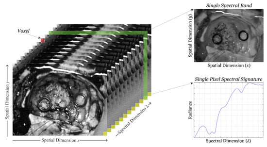 HSI is a promising non-invasive and non-ionizing technique that supports rapid acquisition and analysis of diagnostic information in several fields, such as remote sensing [4,5], archeology [6,7], drug identification [8,9], forensics [10,11,12], defense and security [13,14], agriculture [15,16], food safety inspection and control [17,18,19], among many others. Particularly, several studies can be found in the literature where HSI is applied to different medical applications [20,21,22]. It has been proven that the interaction between the electromagnetic radiation and matter carries useful information for medical diagnostic purposes [20]. As an alternative to other existing technologies for diagnosis, one of the strengths offered by HSI is being a completely non-invasive, non-contact, non-ionizing and label-free sensing technique. In medical applications, this technology has been employed in several different areas such as blood vessel visualization enhancement [23,24], intestinal ischemia identification [25], oximetry of the retina [26,27,28], estimation of the cholesterol levels [29], chronic Cholecystitis detection [30], histopathological tissue analysis [31,32,33,34], diabetic foot [35], etc. In recent years, medical HSI has started to achieve promising results with respect to cancer detection through the utilization of cutting-edge machine learning algorithms and increased modern computational power [20,21,36].