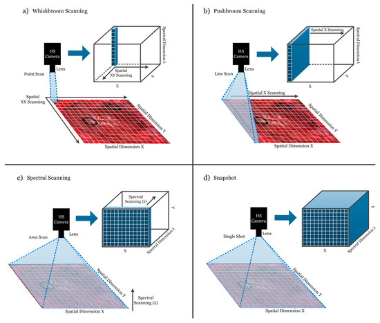 HS cameras are mainly classified into four different types (Figure 3) depending on the methods employed to obtain the HS cube: whiskbroom (point-scanning) cameras, pushbroom (line-scanning) cameras, cameras based on spectral scanning (area-scanning or plane-scanning), and snapshot (single shot) cameras [17].