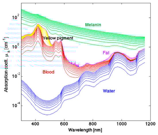 A few representative major molecular contributions to the absorbance at wavelengths of light typical for HSI investigations of biological tissue [107]. Reproduced with permission from [107]; published by IOP Publishing (2013).
