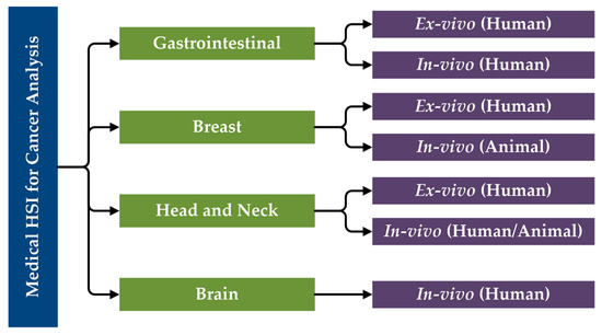 The primary research performed in the literature related to the use of HSI for cancer analysis can be categorized first by organ systems, next the type of tissue samples and experimental design (ex vivo, in vivo), and finally the type of subjects (human, animal). Moreover, in vitro studies will not be included in this review of state-of-the-art works for cancer detection. Considering this, a specific taxonomy has been established related to the studies performed in this area that have been reviewed in this paper (Figure 5).