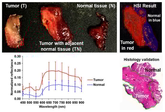 Head and neck SCC was studied in-vivo using HS images from mice with SCC. The studies were performed in the VNIR range between 450 and 950 nm using a CRI system (Perkin Elmer Inc., Waltham, Massachusetts), which is comprised of a Xenon illumination source, LCTF, and a 16-bit CCD camera capturing images at a resolution of 1040 by 1392 pixels and a spatial resolution of 25 µm per pixel. Lu et al. published several works in this field, where the tensor decomposition, PCA and KNN methods were employed to perform a feature extraction and automatic classification, achieving a sensitivity of 93.7% and a specificity of 91.3% in the discrimination of tumor and normal tissue [132,133]. Furthermore, the group also studied the tumor margin during the surgical procedures performing an in-vivo/in-vitro registration between the in-vivo HS images and the histological images to validate the results [134].