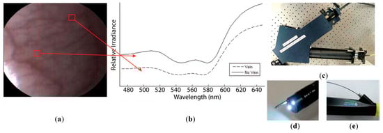 HS image example of the lower lip of a normal human acquired with the image mapping spectroscopy (IMS) endoscope developed in [142]. (a) RGB representation; (b) Spectral signature of the normal tissue pixel and a vein pixel; (c) Clinical setup of the IMS endoscope; (d) Miniature imaging end of the IMS endoscope; (e) Fiber optics of the IMS endoscope inserted into the instrument channel. Reproduced from [142]; Creative Commons BY 4.0; published by SPIE (2011).