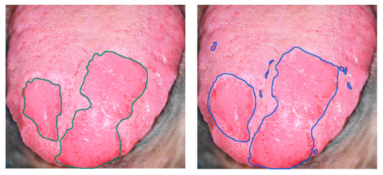 Delineation of the tongue tumor region in [146]. Expert labeling (left) and classifier prediction of tumor regions (right). Reproduced from [146]; Creative Commons BY 4.0; published by MDPI (2012).