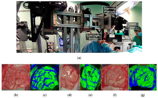 HELICoiD demonstrator [164] and normal brain image results obtained from the validation database employed in [171]. (a) HELICoiD demonstrator; (b,d,f) Synthetic RGB images; (c,e,g) Thematic maps of the HS image, where the normal tissue is represented in green color, the hypervascularized tissue in blue and the background in black. Reproduced from [171]; Creative Commons BY 4.0; published by MDPI (2018).