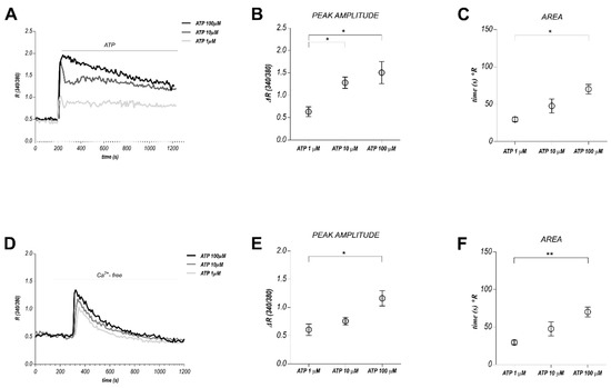 High eATP stimulation triggers biphasic Ca2+ signals in BTEC. (A) Representative traces of different Ca2+ signals evoked by three different eATP concentrations (1, 10, 100 µM). (B,C) Quantification of the peak amplitude and area obtained upon 1, 10, 100 µM ATP stimulation. Area is calculated at 300 s from the beginning of the response. Data are expressed as mean ± SEM. * p-value < 0.05. (D) Representative traces obtained upon 100 µM ATP stimulation in Ca2+ free extracellular medium. (E,F) Quantification of peak amplitude and total area under the calcium spike. Data are expressed as mean ± SEM. * p-value < 0.05; ** p-value < 0.005. Traces in A and D represent the average of all the cells in one representative experiment.