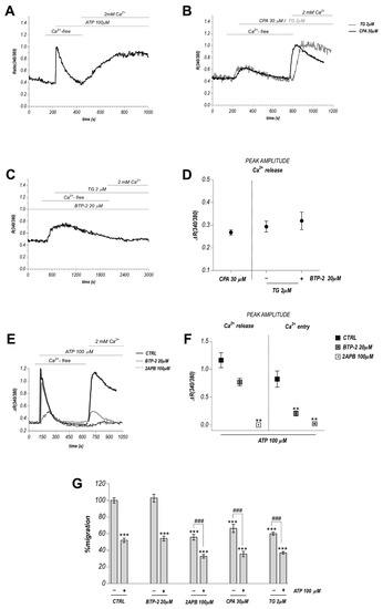A pharmacological approach was employed to modulate the SOCE-related component of the Ca2+ response to 100 μM ATP in BTEC and to clarify its contribution to the process under investigation. As expected, pretreatment with the SOCE inhibitor 20 µM BTP-2 (20 min) completely abolished TG-induced calcium entry in add-back experiments (Figure 2C,D).