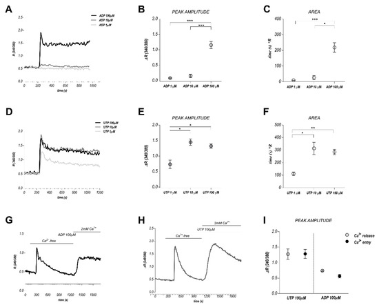 We previously reported anti-migratory activity for 100 µM ADP, but not for 100 μM UTP [36]. Both the agonists evoked dose-response calcium increases in physiological extracellular solution (Figure 3A–F). The add-back protocol allowed us to quantify Ca2+ release and Ca2+ entry (Figure 3G–I).