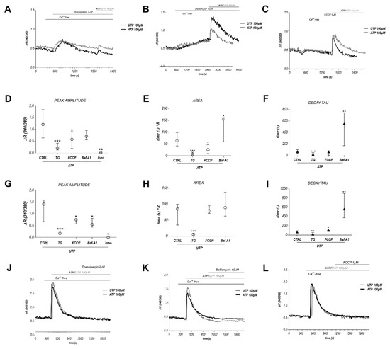 Interplay among different intracellular organelles in BTEC. (A–C) Effect of 2 µM TG, 10 µM Baf-A1 and 1 µM FCCP on the responses to 100 µM eATP or UTP. Representative traces. (D–I) Quantification of the previous experiments. Data are expressed as median over the total range of values. * p-value < 0.05; ** p-value < 0.005; *** p-value < 0.0005 vs. CTRL. (J–L) Effect of TG, Baf-A1 and FCCP in cells pretreated with 100 µM ATP or UTP.