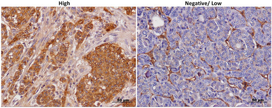 Anexeleto (AXL) staining in thyroid cancer samples. Representative images of high and low/negative AXL immunohistochemical staining in thyroid cancer samples at 40× magnification, scale bar = 50 μm. High and negative/low staining was defined as described in the Section “Materials and Methods”.