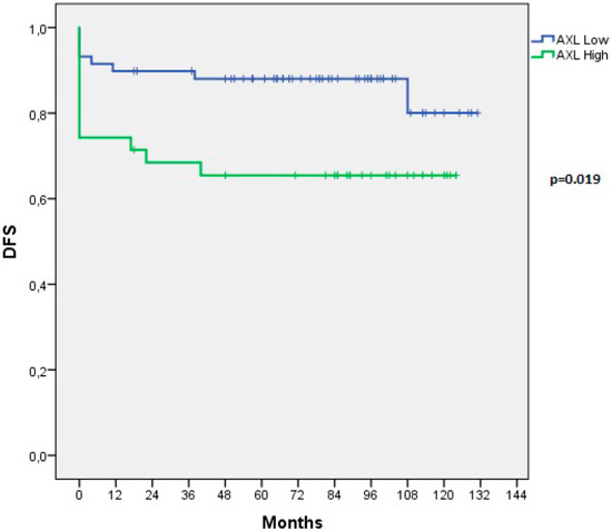 To evaluate the potential significance of AXL expression and its prognostic power in PTCs, we searched for the correlations between AXL expression levels and clinico-pathologic parameters. AXL expression levels did not correlate with patient age, tumor stage, size of primary tumor (T), or the presence of lymph-nodal metastases (N) (Table 1). Instead, all RAI-R tumors displayed high AXL expression (p < 0.0001). In order to search for association of AXL with more aggressive diseases, we looked at its expression levels in patients with complete remission compared to that with persistent or recurrent diseases. Our case pool included 14 persisting and eight recurrent diseases. High AXL expression positively correlated with disease persistence/recurrence (p = 0.028) (Table 1). We also evaluated the effects of AXL expression levels on Disease Free Survival (DFS) in our PTC casistic and we could demonstrate that high AXL expression inversely correlated with DFS (p = 0.019) (Figure 3). Similarly, an RNAseq analysis (http://www.cbioportal.org) showed that lower AXL mRNA expression was significantly associated to better overall survival and disease-free status of PTC patients [9,10].