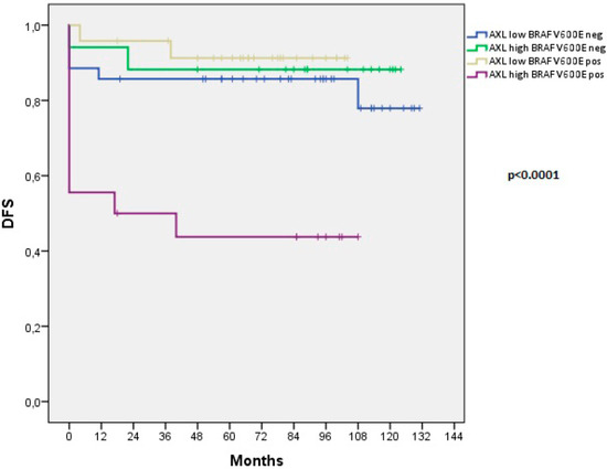 However, to understand whether the concomitant presence of BRAF V600E mutation and AXL expression could identify a subgroup of particularly aggressive PTCs, we conducted a further association analysis. We found that concomitant BRAF V600E mutation and high AXL expression correlated with RAI-R (p < 0.0001) and disease recurrence (p < 0.0001) (Table 4) more significantly than the high AXL expression or the BRAF V600E mutation singularly considered (Table 1 and Table 2). High AXL samples bearing BRAF V600E mutation showed also a significantly reduced DFS (p < 0.0001) compared to PTCs with only high AXL expression, BRAF V600E mutation, or with the absence of both conditions (Figure 4).