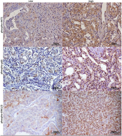 Signaling pathway activation in thyroid cancer samples. Immunohistochemical staining of representative Papillary thyroid carcinoma (PTC) samples with anti-phospho-AKT1, anti-phospho-p65 NF-kB, anti-phospho-ERK1/2 at 40× magnification, scale bar = 50 μm. High and low staining for each protein are defined as described in the Materials and Methods section.