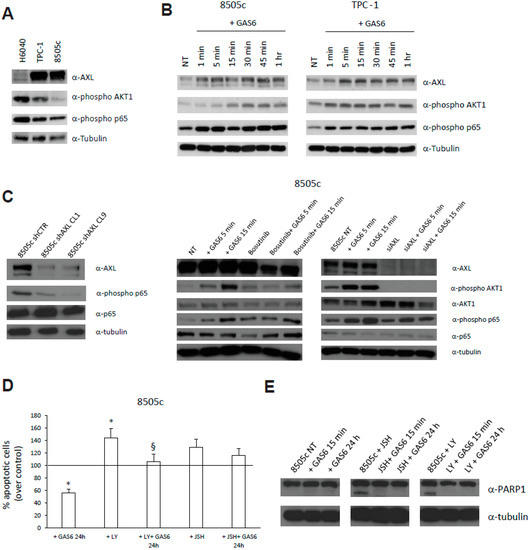 In vitro evaluation of AXL functions. (A) AXL, phospho-AKT1 and phospho-p65 levels evaluated in the indicated thyroid cell lines by Western Blot (WB) analysis. Anti-tubulin antibodies served as control for equal loading. (B) AXL, phospho-AKT1 and phospho-p65 levels in 8505c and TPC-1 cells treated with GAS6 (100 ng/mL) for the indicated time points, evaluated by WB analysis. (C) Levels of AXL, phospho-p65, and p65 in 8505c cell clones stably silenced for AXL (shAXL). Two clones are shown. AXL, phospho-AKT1, AKT1, phospho-p65, and p65 levels in 8505c cells treated or not with GAS6 (100 ng/mL) for the indicated time points in the presence or absence of Bosutinib (25 μM) or siRNAs targeting AXL (siAXL). Anti-tubulin antibodies served as control for equal loading. (D) Percent relative to control of 8505c apoptotic cells, assessed by TUNEL assay, treated or not with GAS6 (100 ng/mL) in the presence or absence of LY294002 (15 μM—AKT1 inhibitor) and JSH23 (5 μM—p65 inhibitor). * p < 0.05 vs. not treated cells. §, p < 0.05 vs. the relative control. (E) PARP1 cleaved levels in 8505c cells treated or not with GAS6 (100 ng/mL) in the presence or absence of LY294002 (15 μM) and JSH23 (5 μM). Anti-tubulin antibodies served as control for equal loading.
