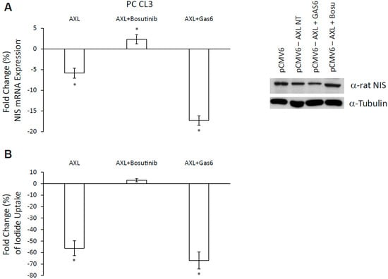 NIS modulation by AXL. (A) NIS mRNA expression and protein levels in PC CL3 cells transfected with pCMV6 empty vector, transfected with AXL and treated for 12 h with bosutinib (5 μM) or GAS6 (100 ng/mL). mRNA expression levels expressed as fold change (%) over control (empty vector-transfected). * p < 0.05 vs. the relative empty vector transfected cells. (B) Iodide uptake levels expressed as fold change (%) over control (empty vector-transfected) in PC CL3 cells transfected with AXL and treated with bosutinib 12 h (5 μM) or GAS6 (100 ng/mL). * p < 0.05 vs. the relative empty vector (pCMV6) transfected cells.