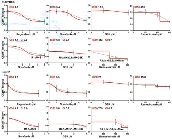 The Combination Indexes (ICs) were computed for these drug combinations. Addition of a low concentration of regorafenib enhanced the inhibitory effect of low concentrations of sorafenib, being the CI for this combination below the line of additivity (CI = 0.9 in both cell lines). The addition of either ramucirumab or GSK1838705A further increased the growth inhibition exerted by regorafenib/sorafenib.