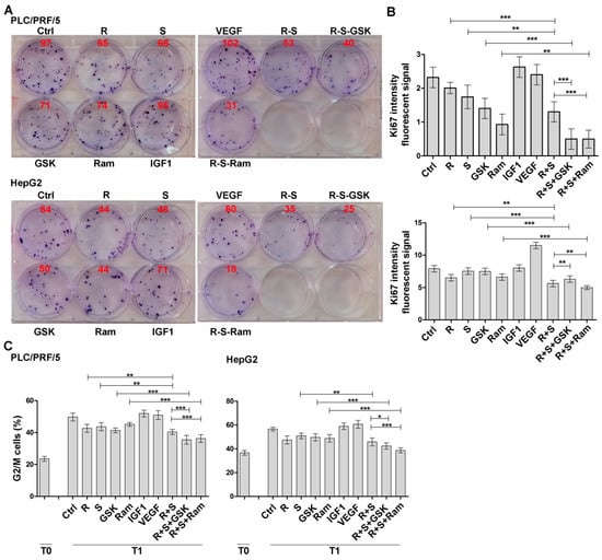 The CI values computed for the two cell lines ranged from 0.4 (PLC/PRF/5) and 0.2 (HepG2) for regorafenib/sorafenib/GSK1838705A and from 0.7 (PLC/PRF/5) and 0.5 (HepG2) for regorafenib/ sorafenib/ramucirumab combinations, respectively. These values were found to be well below the line of additivity (CI ≤ 1), showing that synergy was involved in these drug interactions (Figure 1). IGF1 and VEGF recombinant molecules were used as single treatments, in addition to the described treatments, in order to clarify the effects of IGF1R and VEGFR inhibitors. These experimental conditions were used to evaluate the ability of a single cell to grow into a colony in a clonogenic assay assessed for both HCC cell lines. The effects of single and combination drug treatments were determined after approximately two weeks. The results obtained for each drug treatment are reported in Figure 2A showing a representative assay performed in six-well plates. The number of colonies produced after each treatment was reported in the corresponding well (Figure 2A). The decrease in colony number of each single treatment with respect to control cells as well as the decrease of combination compared with single treatments was similar to the trend of those detected by MTT. These data were expressed as percentage values and reported in Table S1. The effects of the described treatments on cell growth inhibition were evaluated by Ki67 staining, a well-known marker for cell proliferation, restricted to the phases G1, S, G2 and M of cell cycle. The results obtained for both cell lines indicated that after 24 h the combination of regorafenib and sorafenib was more effective than a single drug in reducing the fluorescence signal. The effect of GSK1838705A in enhancing the decrease of fluorescent signal exerted by the combination of regorafenib and sorafenib was significant in PLC/PRF/5 but absent in HepG2 cells in which the stimulatory action of IGF1 was also not relevant. By contrast, the addition of ramucirumab to regorafenib and sorafenib combination caused a significant lowering in Ki67 signal in both cell lines, although VEGF stimulatory action was more pronounced in HepG2 cells (Figure 2B and Table S2). To further confirm the inhibitory effects of the considered drug treatments, the progression on cell cycle was also assessed. The cells were synchronized in the S phase of the cell cycle (T0) with 0.2 M thymidine and after 3 h from block release (T1) the percentage of cells in G0/G1, S and G2/M phases was evaluated by the Cell Cycle Kit. Although it was observed only a small decrease in G2/M transition after the combined regorafenib and sorafenib treatment compared to single treatments, the addition of GSK1838705A and especially of ramucirumab determined a further and significant inhibition in the cell cycle progression in both cell lines (Figure 2C and Figure S1).