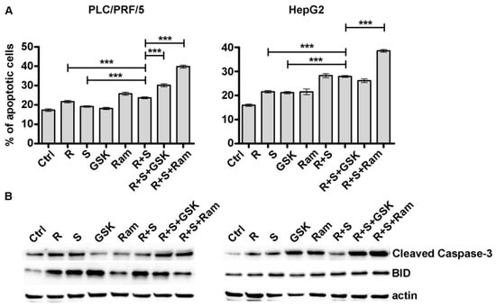 In PLC/PRF/5 cells, regorafenib added simultaneously to sorafenib caused an increase of 22.9% in cellular Annexin V compared with sorafenib-only treated cells. The addition of GSK1838705A caused a further increase of 27.8% compared to the combination of regorafenib and sorafenib. If Ramucirumab was added at the regorafenib/sorafenib combination, a stronger effect on apoptosis was observed (68.6%). A similar trend was found in HepG2 cells with the difference that the combined effect of regorafenib and sorafenib is more pronounced in this cell line (31.6% respect to sorafenib treated cells). Moreover, ramucirumab, which alone had a significant effect in inducing apoptosis (76.8% respect to control cells), was able to further enhance this process in combination with regorafenib and sorafenib (38.4% more than the double treatment) (Figure 3A). Western blotting experiments were also performed to investigate the activation status of Caspase-3 and BID, two pro-apoptotic markers. Activated cleaved Caspase-3 and BID were expressed at comparable levels in single or combination regorafenib and sorafenib-treated cells, whereas cleaved Caspase-3 was significantly activated after the addition of GSK1838705A and ramucirumab to regorafenib/sorafenib double treatment in both cell lines (Figure 3B).