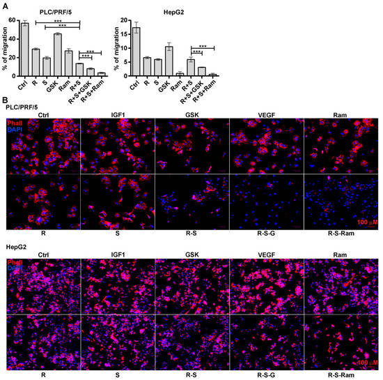 GSK1838705A and ramucirumab potentiate the inhibitory effects of sorafenib/regorafenib combination on HCC cell motility and depolymerization of actin cytoskeleton. Cells were cultured with 2.5 µM (PLC/PRF/5) or 1 µM (HepG2) sorafenib, 1 µM (PLC/PRF/5) or 0.1 µM (HepG2) regorafenib, 3 µM GSK1838705A and 400 µM ramucirumab administrated singularly or in combination. (A) Migration assay in PLC/PRF/5 and HepG2 cultured on fibronectin coated wells. The percentage of migration were calculated at the time T0 and after 48 h (T2). The 100% represents the detection zone completely closed. The experiments were performed in triplicate and the mean values ± SD are plotted in the relative graph. *** p < 0.0001. (B) In addition to the described treatments, IGF1 75 ng/mL and VEGF 20 ng/mL recombinant molecules were used as single treatment. Representative cell staining with DyLight 554 Phalloidin. Scale bar: 100 µm.