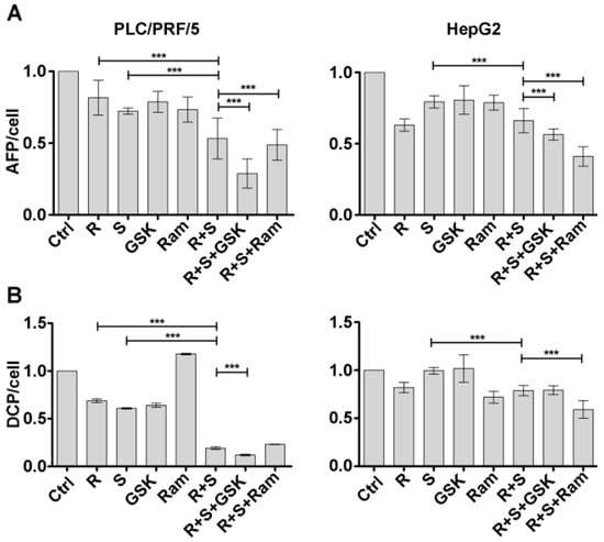All the analyzes presented were performed in two HCC cell lines characterized by a different secretion of AFP and DCP, two markers associated with HCC cell growth and motility. PLC/PRF/5 cells are characterized by low levels of AFP secretion and high DCP, whereas HepG2 cells by contrast secrete high levels of AFP [11] and low of DCP (see Materials and Methods section). The secreted levels of AFP and DCP in the cell culture medium were measured after 48 h of treatments described. Figure 5A and Table S6 showed that, in both cell lines, the inhibitory effect on AFP secretion caused by treatment with regorafenib/sorafenib combination (27% for PLC/PRF/5 and 17% for HepG2 in comparison to sorafenib-alone treated cells) was increased both by the addition of GSK1838705A and by addition of ramucirumab, with a substantial difference in the two cell lines. In PLC/PRF/5 cells the most evident effect was given by the addition of GSK1838705A (45% more than the regorafenib/sorafenib combination treatment) while ramucirumab caused only a minor decrease (7.6% more than the combination treatment).