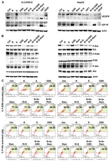 Some of the key molecules involved in the signal transduction of both IGF1R and VEGFR activated cascades were analyzed by western blotting and Muse Activation Dual Detection Kits. MAPK signaling activation was evaluated by measuring the extent of ERK phosphorylation relative to the total ERK expression by western blotting (Figure 6B) and Muse MAPK Activation Dual Detection Kit (Figure 6C). In PLC/PRF/5 cells the combined treatment of regorafenib/sorafenib showed a major inhibition of ERK phosphorylation (14%) compared to sorafenib administered as a single treatment. Addition of GSK1838705A to combination regorafenib/sorafenib treatment caused an additional decrease of 8% in pERK levels. A greater effect was caused by the addition of ramucirumab, which caused a further decrease in ERK phosphorylation levels equal to 21%. In HepG2 cells, GSK1838705A and ramucirumab increased almost similarly the inhibitory effect of the combination of regorafenib/sorafenib on ERK phosphorylation, in particular the 9% inhibition caused by the combination treatment when compared to sorafenib single treatment was increased by a further 17% in the case of addition of GSK1838705A to the culture medium and 18% in the case of addition of ramucirumab (Figure 6C and Table S7). Activation of PI3K/Akt pathway in the same experimental conditions was also investigated, using western blotting and confirmed and quantified by the Muse PI3K Activation Dual Detection Kit. In PLC/PRF/5 cells, regorafenib/sorafenib combination caused a decrease in percentage of activated p-Akt (16.9% lower than the single treatment with sorafenib). This decrease reached 18.8% following the addition of the GSK1838705A to the combination treatment and 24.6% when ramucirumab was added with regorafenib/sorafenib combination. In HepG2 cells the effect of combination regorafenib/sorafenib on Akt phosphorylation levels was almost comparable with the results found in the PLC/PRF/5 cells, in fact the combined treatment caused a 11% reduction in phosphorylation compared to treatment with sorafenib alone. In this cell line the effects evoked by the simultaneous addition to regorafenib/sorafenib treatment of GSK1838705A and especially of ramucirumab were much more evident than in the PLC/PRF/5 cells. In particular, the percentage of p-Akt activation decreased by a further 41% with the addition of GSK1838705A and 51% with ramucirumab (Figure 6C and Table S7).