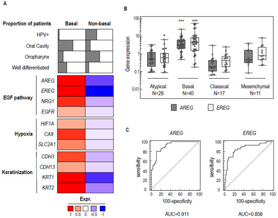 Figure 1. Molecular features of basal head and neck squamous cell carcinoma (HNSCC). (A) Summary of the main pathology features and pathway enrichment analysis of the basal HNSCC subgroup in public omic data sets [5,6,7,8]. (B) Boxplot of the gene expression of AREG and EREG genes measured by RT-qPCR in basal, mesenchymal, atypical, and classical HNSCC. Expression levels were compared between tumor subgroups and were found to be significantly higher in basal HNSCC compared to other molecular subgroups (ANOVA *** p < 0.001). (C) Receiver Operating Characteristic (ROC) curve analyses of the ability of AREG and EREG gene expression levels to discriminate between basal and non-basal HNSCC. The area under the curve (AUC), corresponding to the optimal specificity and sensitivity, is shown.