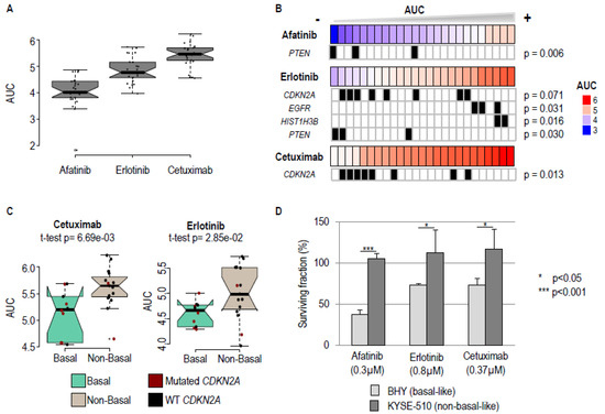In order to evaluate the impact of oncogenic drivers on EGFR blockade, the cell lines were screened for mutations in 26 genes that are routinely investigated in patient tumors (Supplementary Materials Table S3), and the association between mutational status (Supplementary Materials Table S4) and drug resistance/response was investigated. Mutations in four genes (CDKN2A, Phosphatase And Tensin Homolog (PTEN), EGFR, and Histone Cluster 1 H3 Family Member B (HIST1H3B) were found to be associated with response (Figure 2B; p values < 0.1). Mutations in three genes, PTEN, EGFR, and CDKN2A, are associated with an improved drug response (smaller AUC), whilst a mutation in the histone HIST1H3B gene favors drug resistance. Mutations in CDKN2A are the most frequent (8/25 cell lines), and are mainly found in basal cell lines (6/10 basal cell lines, chi² p value = 0.044). Nevertheless, basal status is a better discriminator of response to Erlotinib or Cetuximab than CDKN2A mutations (Figure 2C; compare basal-like and non-basal-like tumors in green and grey).