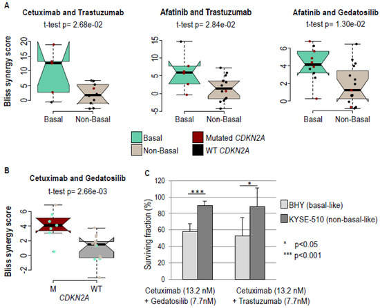 Gedatolisib, Trastuzumab, and Cobimetinib were then tested in combination with the three anti-EGFR drugs (i.e., Cetuximab, Erlotinib, Afatinib). Bliss synergy scoring models were used to compare the efficiencies of these nine combinations (Table 2; note that 0 Bliss synergy scores indicate no synergy, high scores synergy, and negative scores antagonism). Six combinations were found to be synergistic with all of the cell lines (Supplementary Materials Figure S8; red brackets), namely the three combinations with Trastuzumab and with Gedatosilib. Basal status was associated with synergy for three combinations, Cetuximab with Trastuzumab, Afatinib with Trastuzumab, and Afatinib with Gedatolisib (Figure 3A; compare basal-like and non-basal-like tumors in green and grey). Mutation of the CDKN2A gene was statistically associated with the synergy of Cetuximab and Gedatosilib (Figure 3B; compare wild type and mutated CDKN2A tumors in black and red). We validated these results with clonogenic survival assays on selected representative cell lines (BHY and KYSE-510; see above) and discriminatory drug combinations (13.2 nM Cetuximab + 7.7 nM Gedatosilib, or 13.2 nM Cetuximab + 7.7 nM Trastuzumab) identified with the high throughput assay. BHY basal-like cells had a significantly higher sensitivity to these therapeutic combinations than the KYSE-510 non-basal-like cells (Figure 3C).