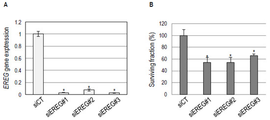 Figure 4. EREG expression inhibition decreases BHY basal cell clonogenic survival. (A) RT-qPCR analysis of the expression of the EREG gene in BHY cells transfected with three independent anti-EREG siRNAs (siEREG#1, 2, and 3). Cells transfected with scrambled siRNA were used as a negative control (siCT). Transfection with siEREG siRNAs yielded a significant >90% inhibition of EREG expression. (B) Analysis of the clonogenic survival of BHY basal cells upon EREG expression inhibition. Transfection with siEREG#1, 2, and 3 significantly reduces BHY cell clonogenic survival. Cells transfected with scrambled siRNA were used as a negative control (siCT). Mean survival fractions and standard errors from three independent experiments are shown. *: p < 0.05.