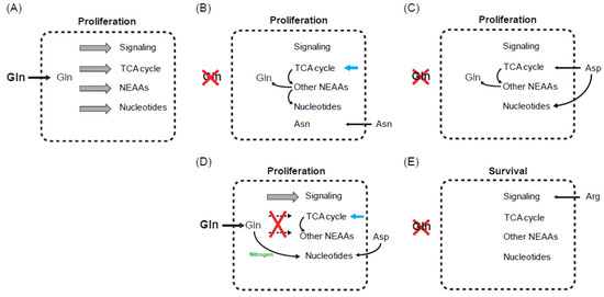 These two works indicate that most glutamine-dependent biosynthetic activities can still proceed, with the exception of asparagine production, when exogenous glutamine is absent. Indeed, work done in vasculature-forming endothelial cells and Kaposi’s sarcoma-associated herpesvirus (KSHV)-transformed fibroblast cells showed a similar effect of asparagine to support cell survival and proliferation following glutamine depletion [48,49]. Importantly, asparagine can rescue glutamine-depletion-induced growth defect in breast tumor cells at concentrations within physiological range (25~100 μM) [44]. At this range of concentrations, none of the other NEAAs can rescue proliferation. Furthermore, introduction of a catalytically active asparaginase, an enzyme to break down asparagine, from lower vertebrates into mammalian cells prevents the ability of asparagine to rescue glutamine starvation at physiological concentrations. Since the putative human asparaginase shows minimal asparaginase activity [44], the authors speculate an evolutionary pressure to cause the selective loss of its activity in mammalian cells as a means to preserve intracellular asparagine in order to mediate cellular adaptation to pathophysiological changes of environmental glutamine levels [44].