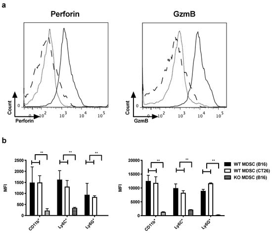Figure 1. In vitro MDSCs express perforin and GzmB. (a,b) MDSCs were generated starting from bone marrow of WT or perforin/GzmB knock out mice (KO) mice using the CM of tumor cells. (a) Representative histograms showing perforin (left) and GzmB (right) expression by in vitro WT (full line) or KO (dotted line) MDSCs (gated on CD11b+ cells) compared to the isotype control (long dashed line), generated using the CM of B16F10-GM-CSF cells. (b) Summarizing graphs showing the mean fluorescence intensity (MFI) of perforin (left) and GzmB (right) of in vitro MDSCs (CD11b+) and of M-MDSCs (CD11b+Ly6C+) and PMN-MDSCs (CD11b+Ly6G+), generated using the CM of B16F10-GM-CSF cells (WT MDSC (B16) and KO MDSC (B16)) and the CM of CT26-GM-CSF cells (WT MDSC (CT26)). The mean +/- standard error of the mean (SEM) of at least three experiments is shown. A student’s t-test was used to calculate statistical significance. The number of asterisks in the figures indicates the level of statistical significance as follows: **, p < 0.01.