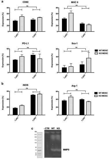 Figure 3. In vitro WT and KO MDSCs show similar properties. (a) Summarizing graphs showing the expression of different surface markers (CD80, MHC II, programmed death-ligand 1 (PD-L1), and Sca-1) on WT and KO MDSCs, gated by CD11b+. Expression showed in M-MDSCs (Ly6C+) and PMN-MDSCs (Ly6G+) separately. (b) Summarizing graphs showing the expression of functional markers (inducible nitric oxide synthase (iNOS) on the left and arginase-1 (Arg-1) on the right) on WT and KO MDSCs. The mean +/-SEM of at least three experiments is shown in all graphs. A student’s t-test was used to calculate the statistical significance. The number of asterisks in the figures indicates the level of statistical significance as follows: ns, >0.05 and *, p > 0.05. (c) Representative image of gelatin zymography assay showing MMP9 activity in WT and KO MDSCs.