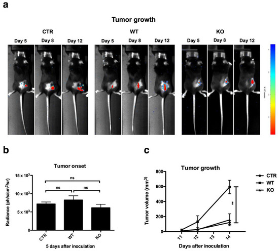 Next, we performed an in vivo experiment in which B16F10-Fluc cells were co-injected with MDSCs generated from the bone marrow of WT or KO mice using CM collected from B16F10-GM-CSF cells. In vivo bioluminescence imaging, which can detect early tumor onset as the B16-F10 cells express Fluc, was used to follow up the primary tumor growth rate and possible formation of metastasis (Figure 4a). The tumor onset (day five) was not affected by the co-injection of B16F10-Fluc cells with WT versus KO MDSCs (Figure 4b). However, we observed that tumor cells inoculated together with WT MDSCs had a growth advantage over tumor cells inoculated without MDSCs or with KO MDSCs with the majority of tumors reaching 500 mm3 on day 14, at which time the tumors generated by co-injection with KO MDSCs were on average 122 ± 98 mm3, as measured by caliper (Figure 4c). Primary tumors were resected when they reached 502 ± 103 mm3, and occurrence of metastasis was followed by in vivo bioluminescence imaging, expecting an in vivo bioluminescent signal at regions where B16F10-Fluc cells grow. However, metastases were not observed in any of the conditions, despite a follow up time of 30 days.