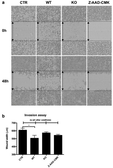 Figure 5. GzmB expressed by MDSCs facilitate migration of tumor cells. (a) Representative images of the in vitro invasion assay after 48 h incubation. (b) Summarizing graph of the in vitro invasion assay showing the wound width after 48 h of incubation. The following conditions were shown: B16F10 cells alone (CTR), B16F10 cells supplemented with WT MDSCs (WT), B16F10 cells supplemented with KO MDSCs (KO), and B16F10 cells supplemented with WT MDSCs and the GzmB inhibitor Z-AAD-CMK (10 μM) (Z-AAD-CMK), respectively. The mean +/-SEM of at least fivw data points is shown. A student’s t-test was used to calculate the statistical significance. The number of asterisks in the figures indicates the level of statistical significance as follows: ns, > 0.05 and *, p < 0.05.