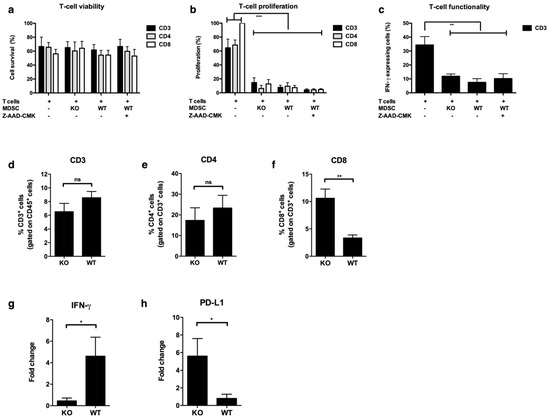 We first performed an in vitro co-culture assay to study the survival, proliferation, and function of T-cells when cultured with KO or WT MDSCs either in or not in the presence of the GzmB inhibitor, Z-AAD-CMK. However, we did not observe significant differences for any of the evaluated parameters between T-cells cultured in the presence of WT MDSCs, with or without the GzmB inhibitor or KO MDSCs (Figure 6a–c).